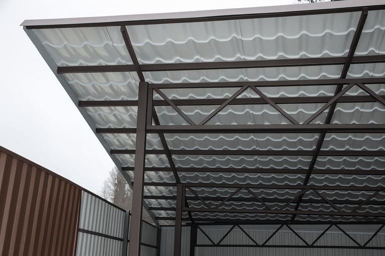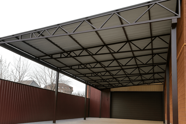 Чем больше площадь перекрытия, тем выше расход материалов и трудозатраты. Для небольших навесов можно использовать облегчённые решения, тогда как для просторных потребуются усиленные опоры и фермы. -